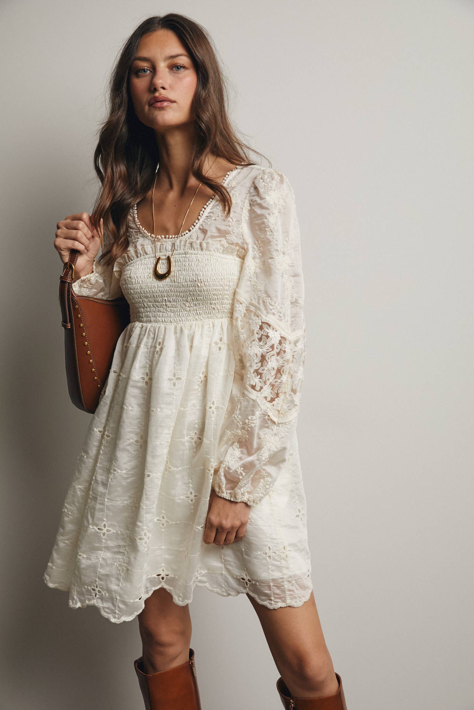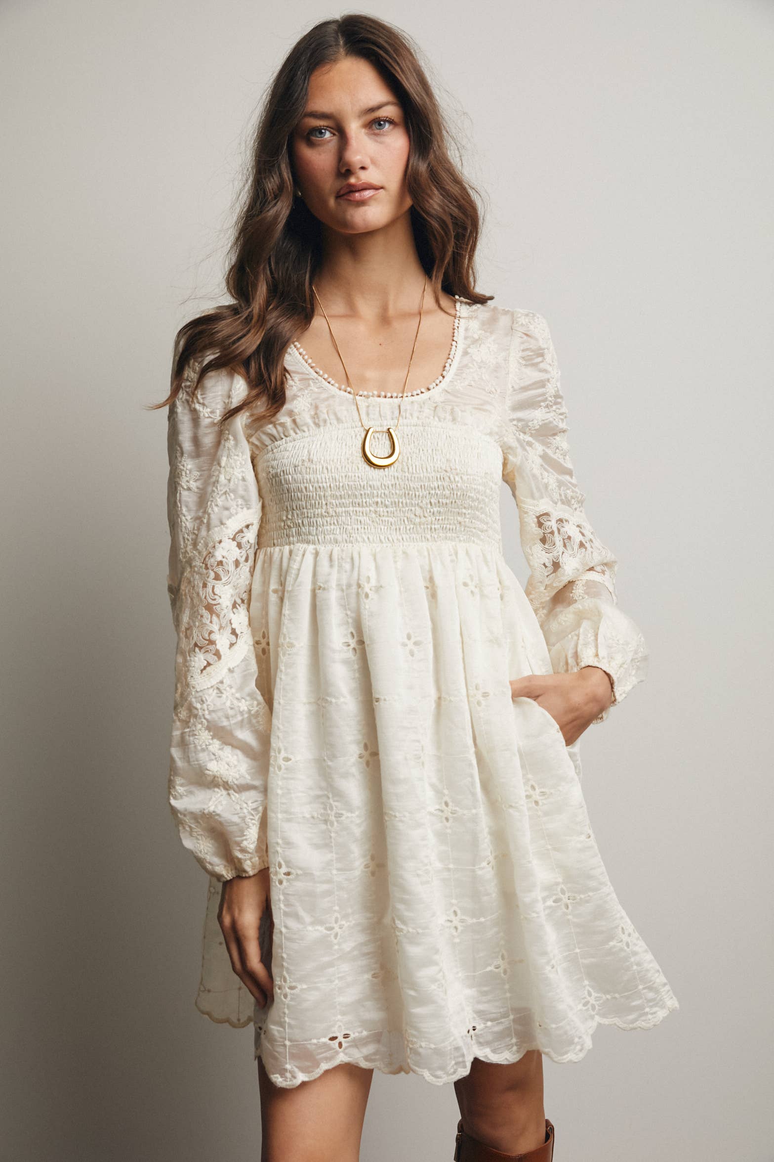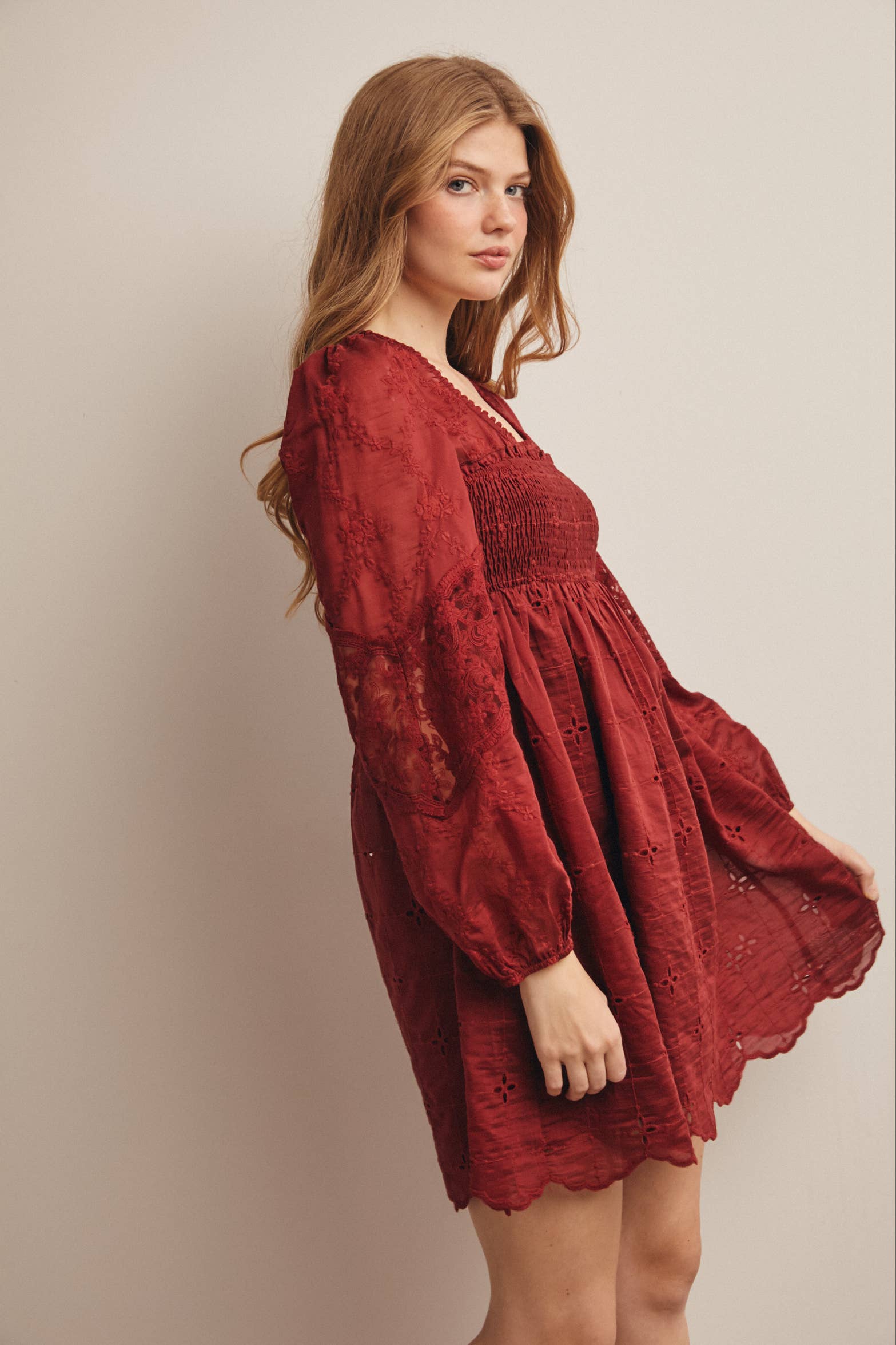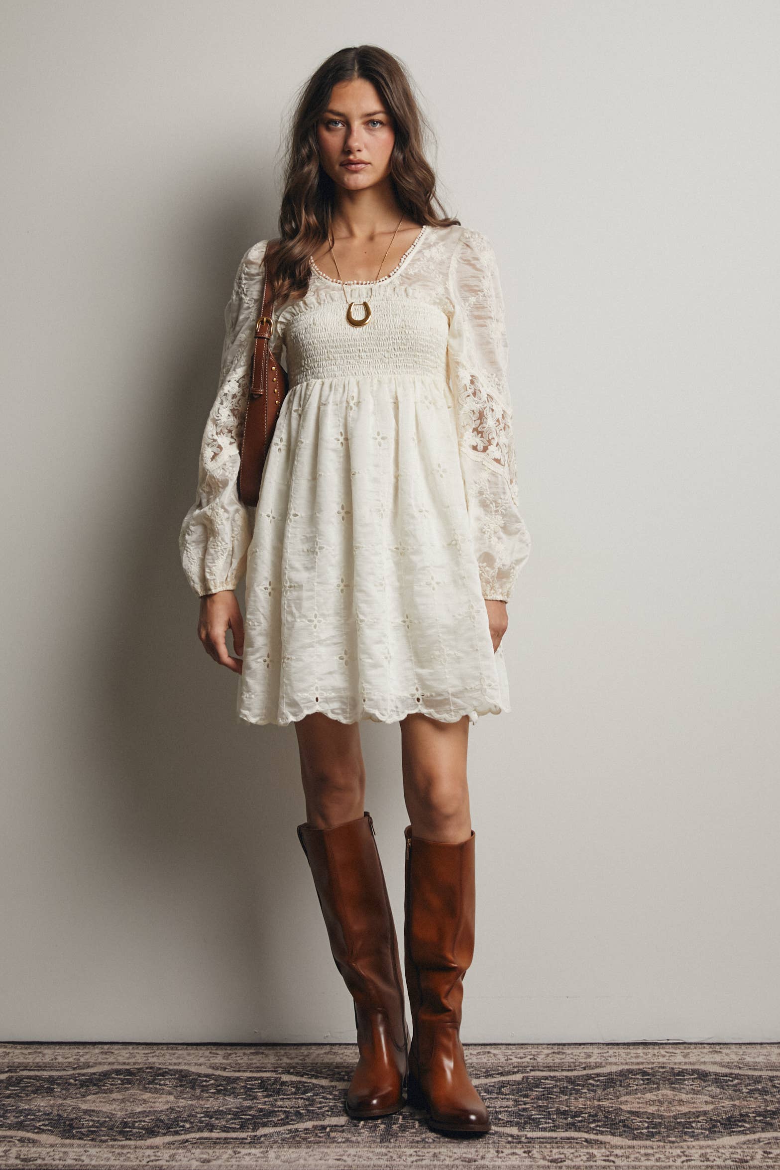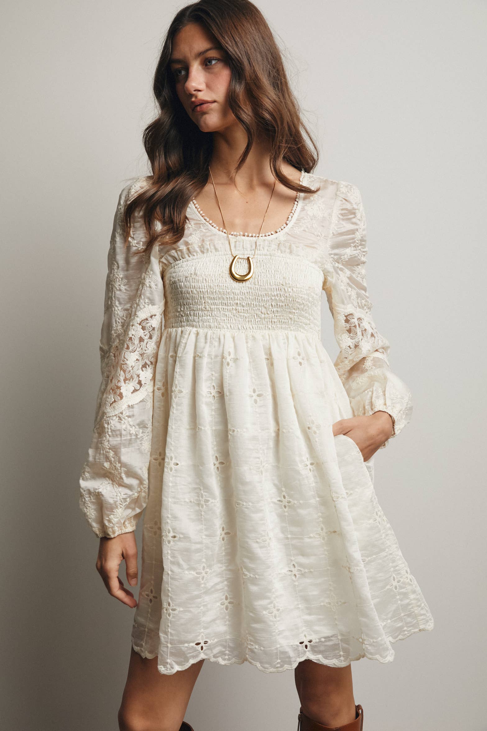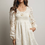 - Lightweight Woven Fabric: Fully lined for comfort and coverage - Smocked Bodice: Stretchy, fitted bodice for a flattering silhouette - Sheer Lace Sleeves: Intricate embroidery and billowy shape for a romantic feel - Scoop Neckline: Softly rounded with delicate trim details - Scalloped Hem: Eyelet embroidery finish adds feminine charm - Side Seam Pockets: Functional detail for effortless wear - Back Tie Detail: Open back with a dainty tie for an elegant finish - Model is 5' 9" 32-24-34 and wearing a size Small Feminine and timeless, this embroidered lace mini dress blends boho elegance with romantic detailing-perfect for holiday gatherings, seasonal events, or dressed-down with boots for everyday wear.