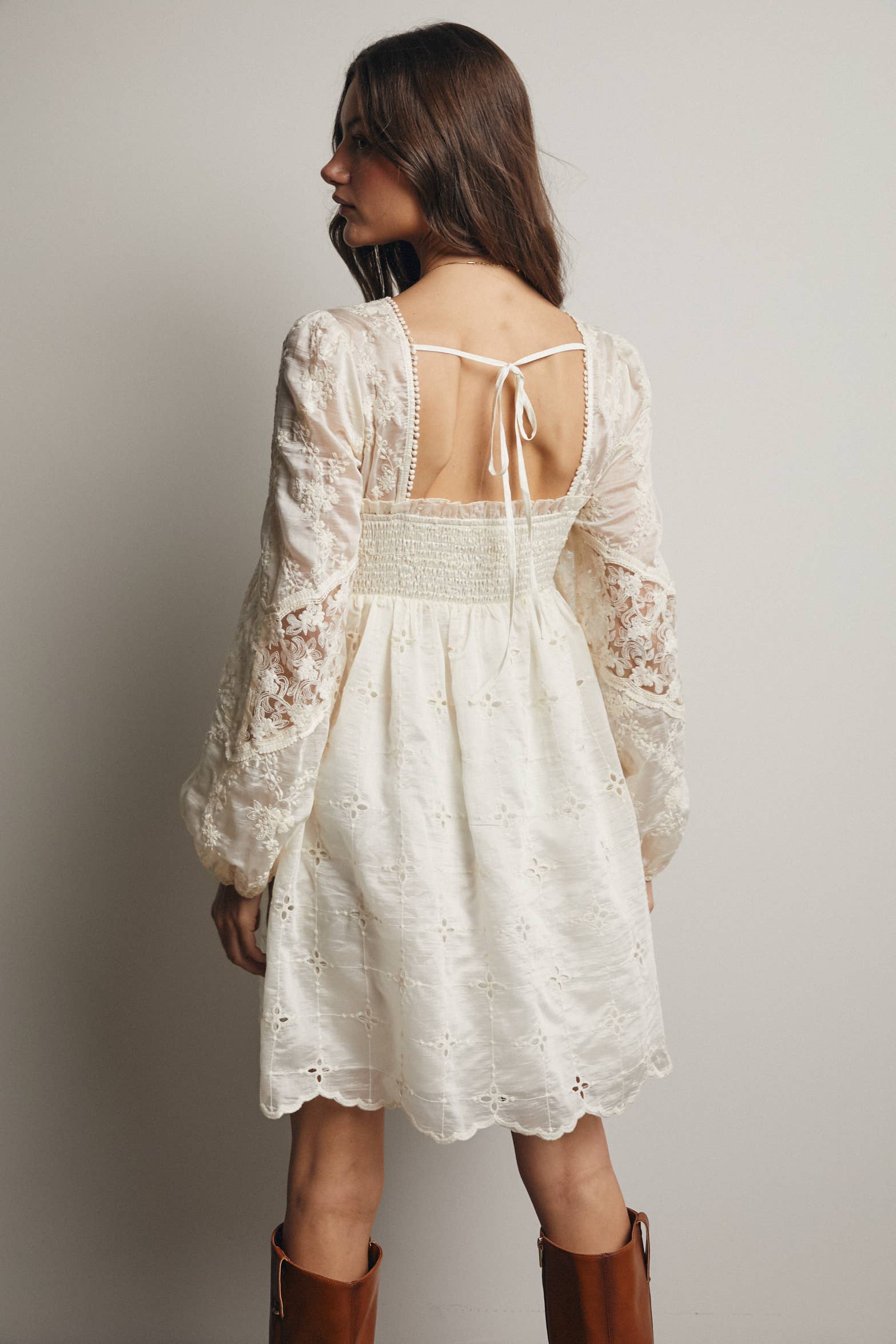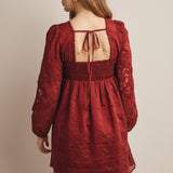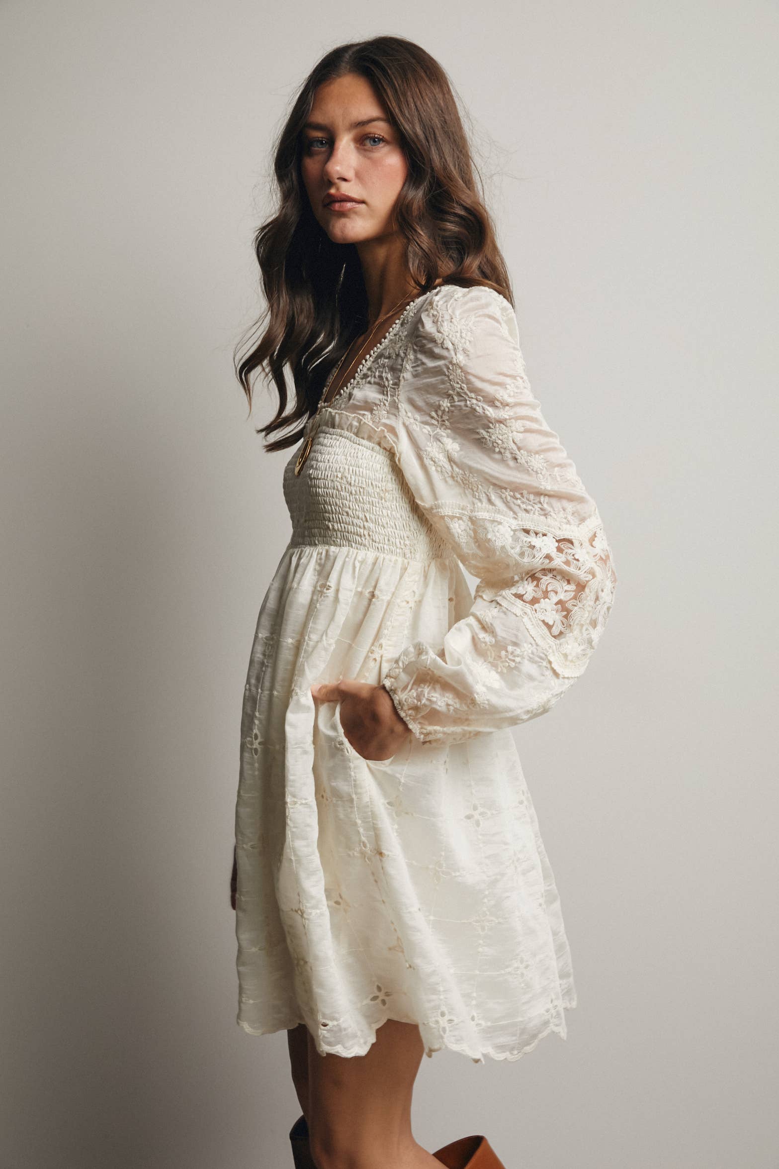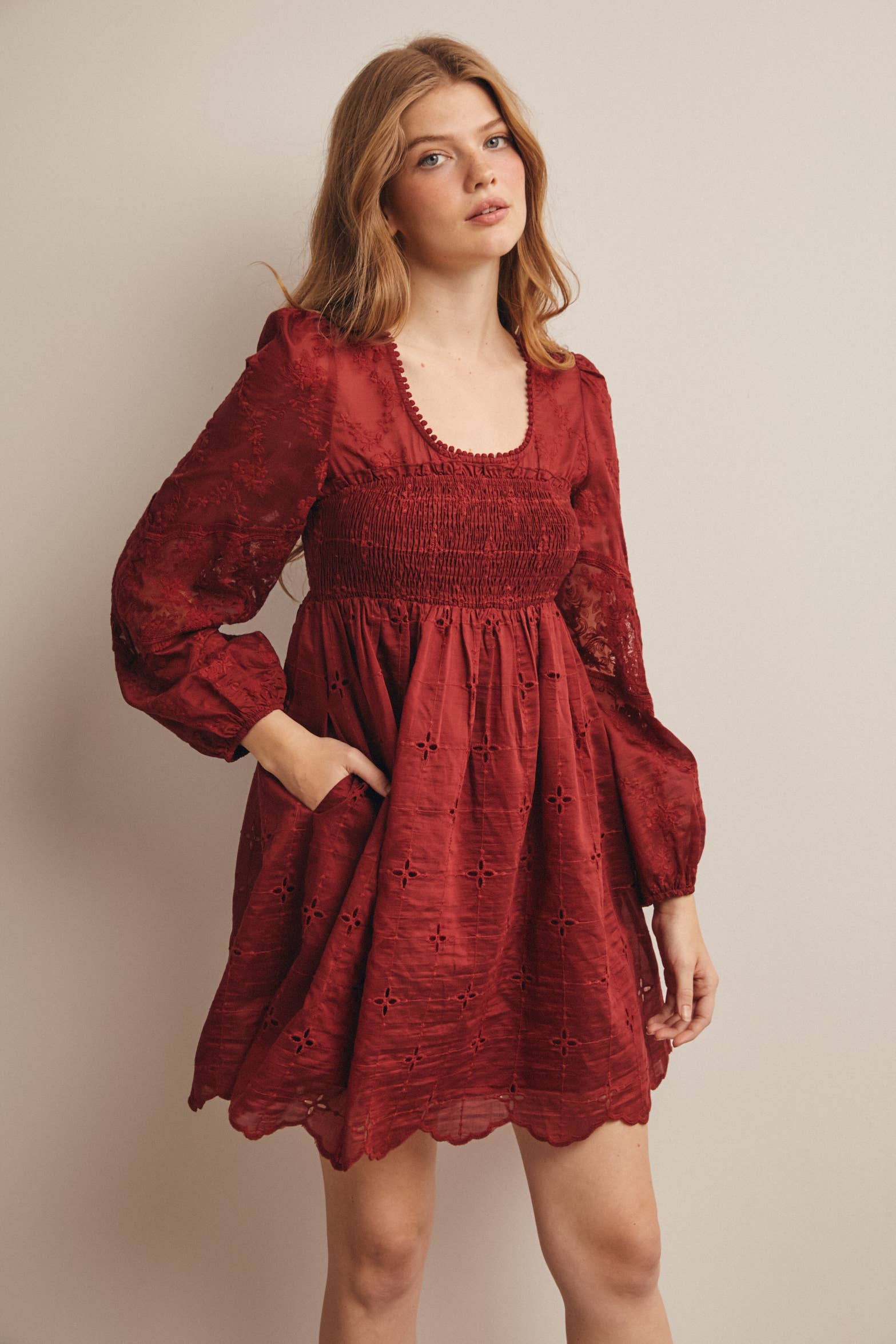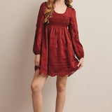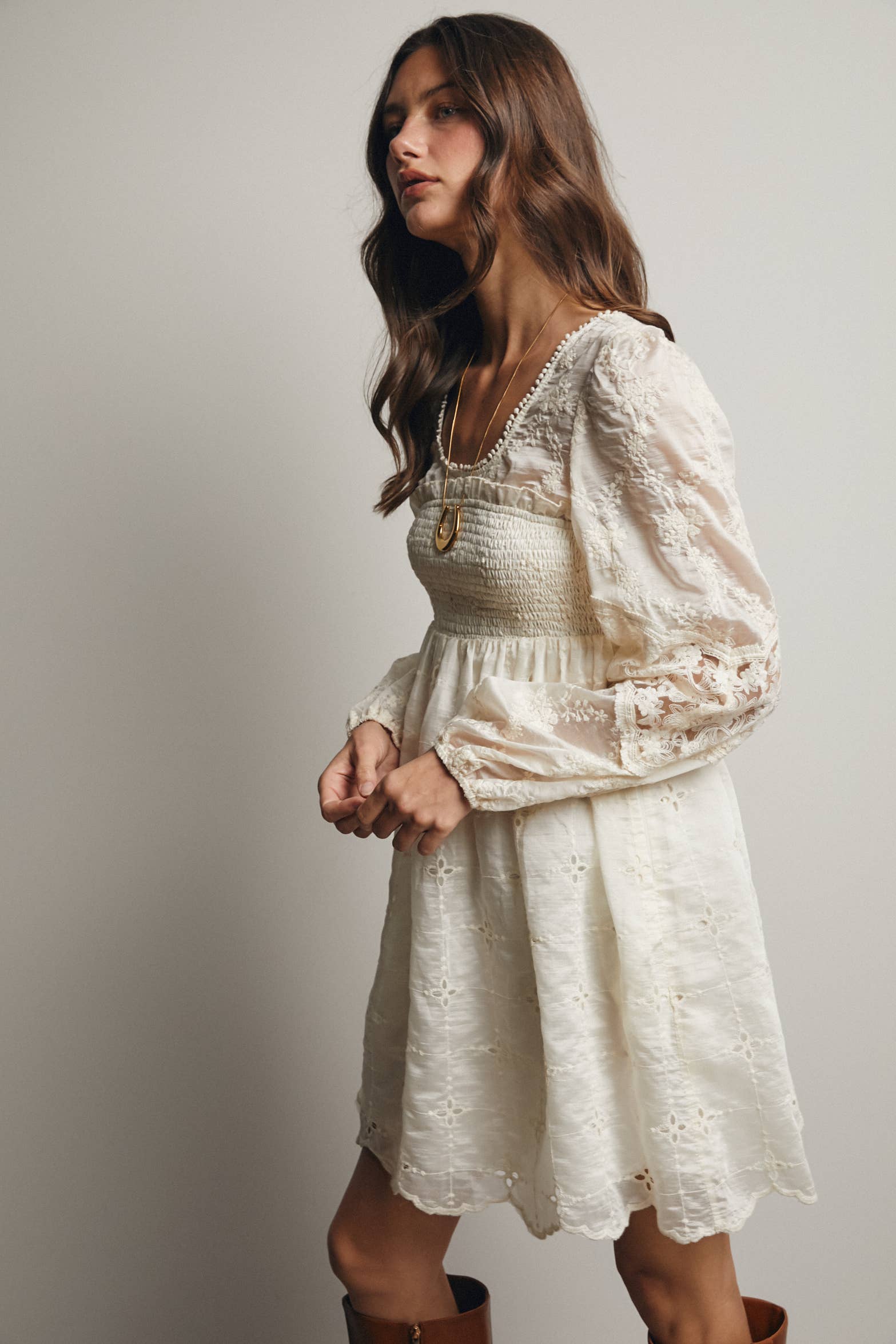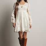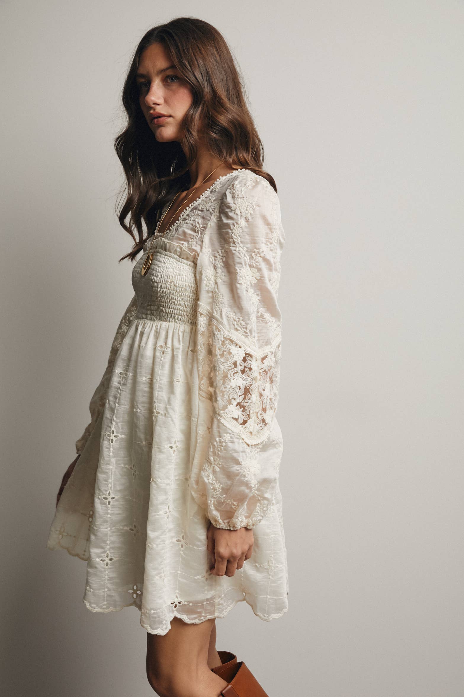 - Lightweight Woven Fabric: Fully lined for comfort and coverage - Smocked Bodice: Stretchy, fitted bodice for a flattering silhouette - Sheer Lace Sleeves: Intricate embroidery and billowy shape for a romantic feel - Scoop Neckline: Softly rounded with delicate trim details - Scalloped Hem: Eyelet embroidery finish adds feminine charm - Side Seam Pockets: Functional detail for effortless wear - Back Tie Detail: Open back with a dainty tie for an elegant finish - Model is 5' 9" 32-24-34 and wearing a size Small Feminine and timeless, this embroidered lace mini dress blends boho elegance with romantic detailing-perfect for holiday gatherings, seasonal events, or dressed-down with boots for everyday wear.