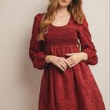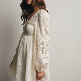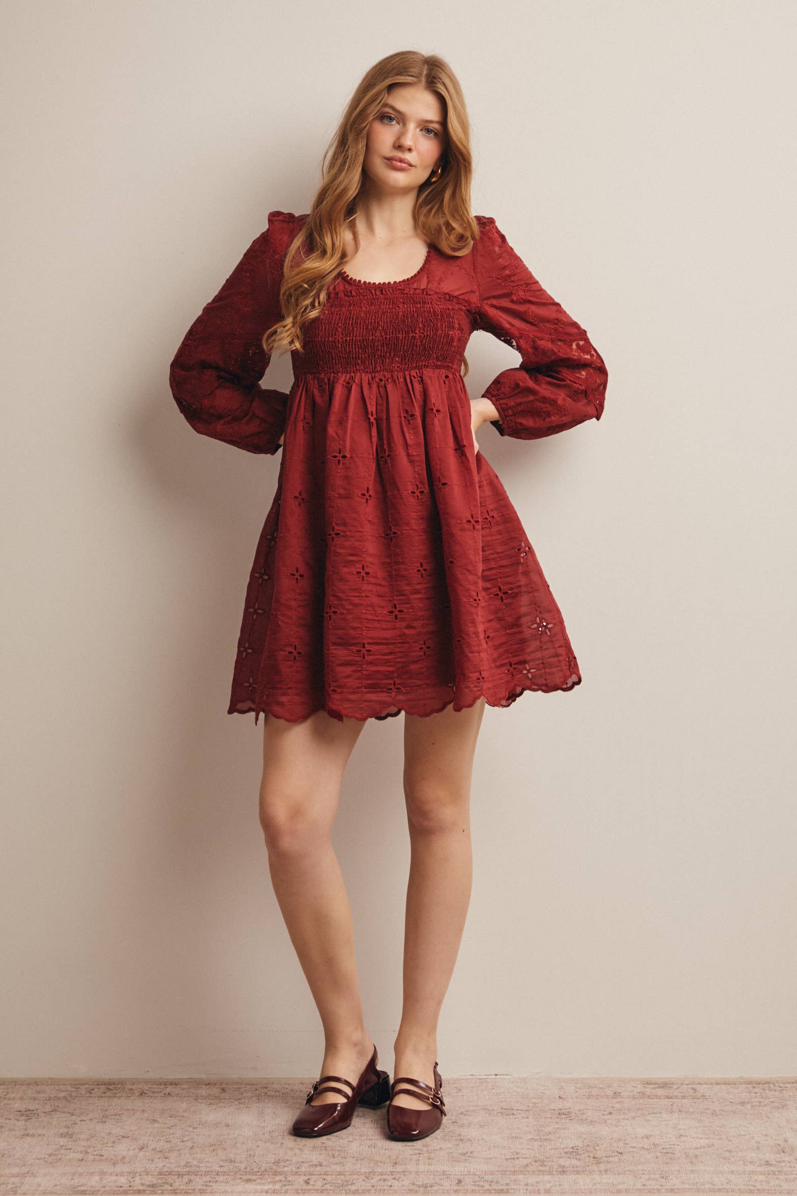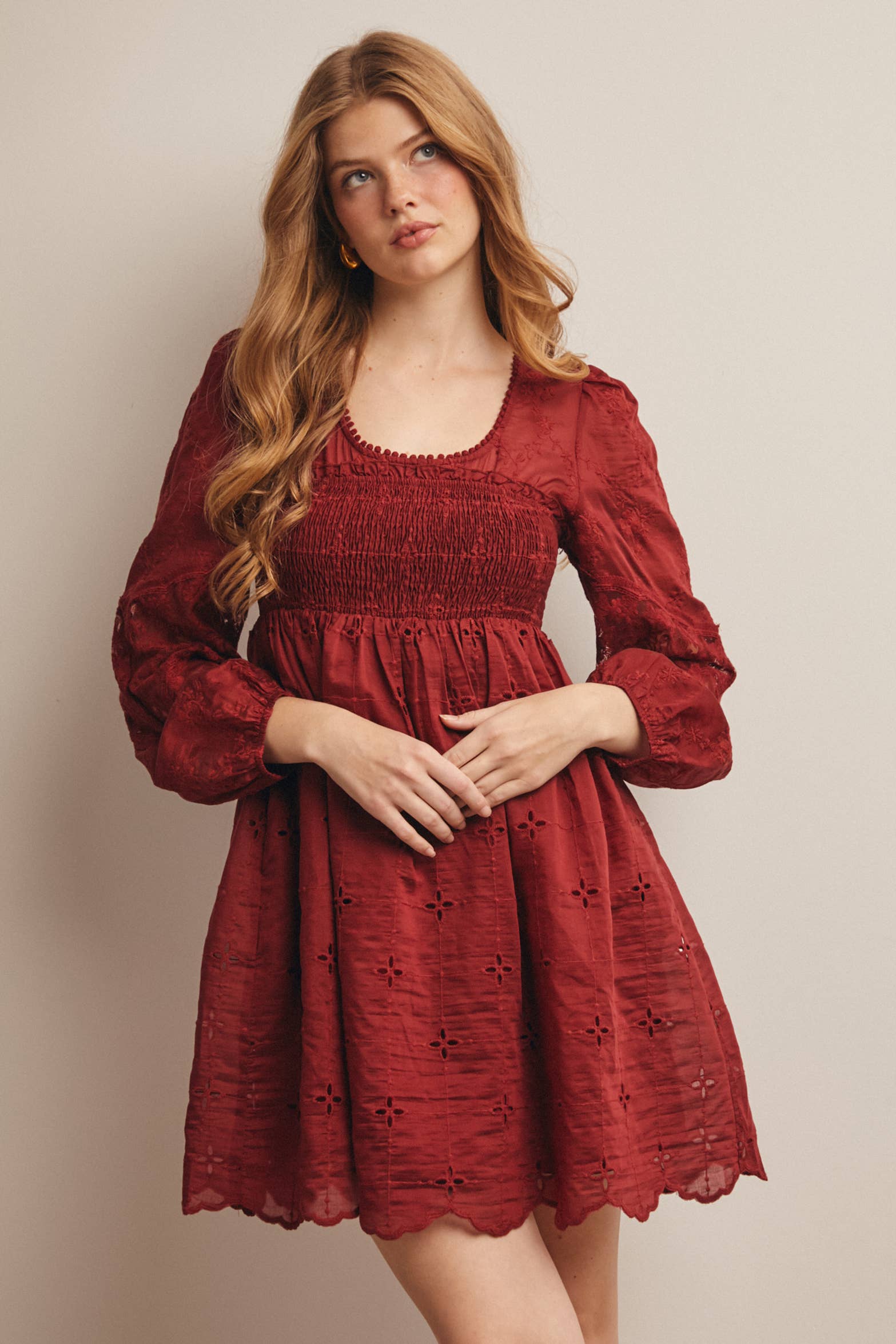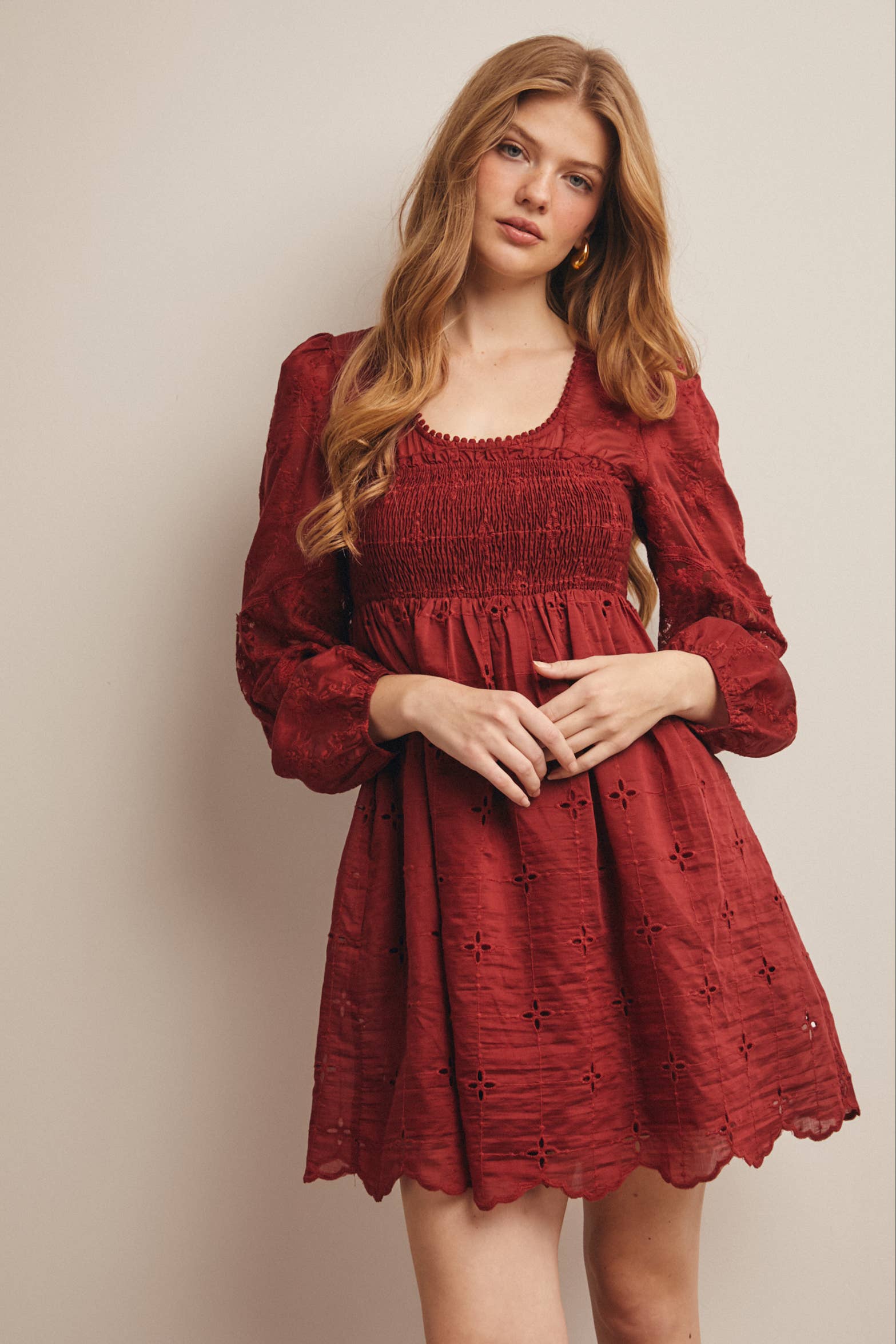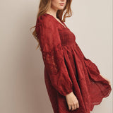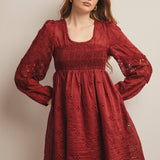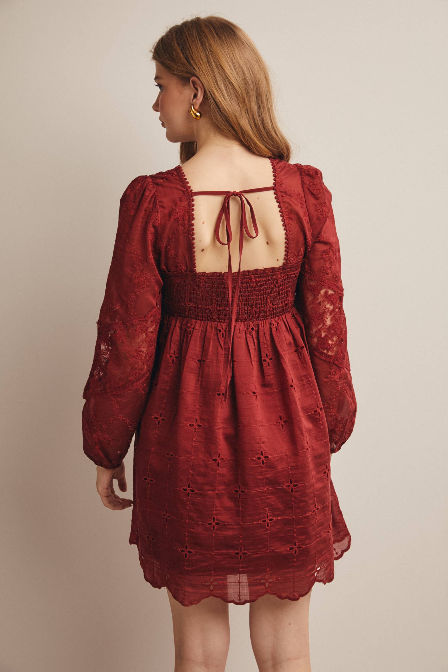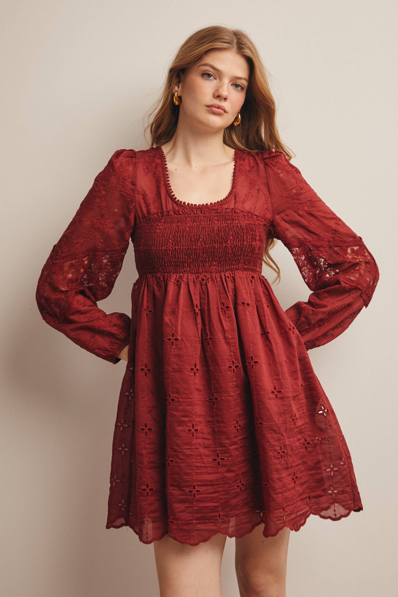 - Lightweight Woven Fabric: Fully lined for comfort and coverage - Smocked Bodice: Stretchy, fitted bodice for a flattering silhouette - Sheer Lace Sleeves: Intricate embroidery and billowy shape for a romantic feel - Scoop Neckline: Softly rounded with delicate trim details - Scalloped Hem: Eyelet embroidery finish adds feminine charm - Side Seam Pockets: Functional detail for effortless wear - Back Tie Detail: Open back with a dainty tie for an elegant finish - Model is 5' 9" 32-24-34 and wearing a size Small Feminine and timeless, this embroidered lace mini dress blends boho elegance with romantic detailing-perfect for holiday gatherings, seasonal events, or dressed-down with boots for everyday wear.