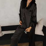 Discover the art of luxury with our Black Feathers Satin Pants Set. Beyond its beautiful appeal, it's a testament to our superior quality and comfort. Crafted from an exquisite satin fabric that blends the subtle stretch of spandex, every inch promises an added touch of flexibility and softness.