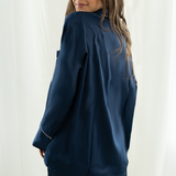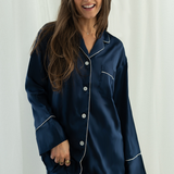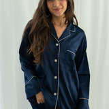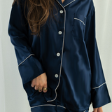 Our Navy Long Sleeve Top and Shorts Sets with White trim exude timeless elegance. The white trim makes for a lovely contrast against the navy set.