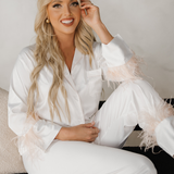 White with Blush Feathers Satin Pants Set