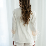 Discover the art of luxury with our White with Blush Feathers Satin Shorts Set. Beyond its beautiful appeal, it's a testament to our superior quality and comfort. Crafted from an exquisite satin fabric that blends the subtle stretch of spandex, every inch promises an added touch of flexibility and softness.