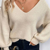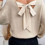 V-neck plain knit sweater with back tie