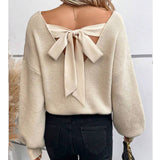 Enhance your wardrobe with our stylish V-neck plain knit sweater featuring a back tie detail. Indulge in the luxurious comfort and classic elegance of this must-have piece.