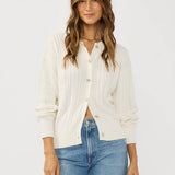 Classic and cozy, this cable knit cardigan features a crew neckline, long sleeves, and ribbed trims for a structured yet soft fit. Finished with a front button closure, it’s a timeless layer perfect for effortless everyday wear.