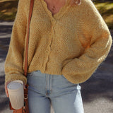 Add a playful twist to your everyday look with the Lantern Sleeve Scallop V Neck Buttoned Front Cardigan. Its charming scalloped edges and flirty lantern sleeves bring a lighthearted elegance to your outfit, while the V-neck and buttoned front make it easy to layer over your favorite tops. Crafted for comfort without sacrificing style, this cardigan lets you express your personality effortlessly, whether you’re out for brunch or enjoying a cozy evening in. A delightful addition that brightens your wardrobe with fun sophistication.