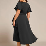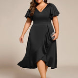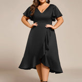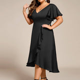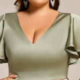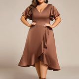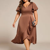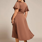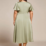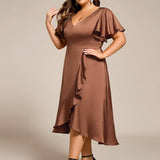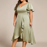 Elegant and sophisticated, this midi-length satin bridesmaid dress features captivating ruffles on the sleeves and a regular fold, stream asymmetrical hem. Crafted from premium satin, the dress flows gracefully, highlighting your curves and creating a striking silhouette. The asymmetrical hem adds a modern, dynamic flair, making it the perfect choice for weddings and special occasions. Embrace elegance and stand out in this exquisite, midi-length bridesmaid dress.